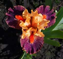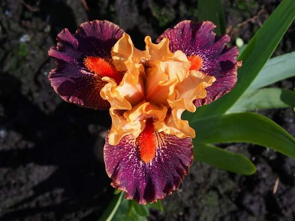 Ирис бородатый карликовый Alaia (Алайя). Очень нарядный, с необычной окраской. Стандарты оранжевые, фолы с бордовой пликатой. Бородка мандариновая, искрящаяся. Высота 33 см.