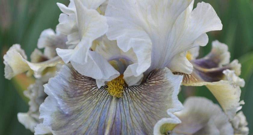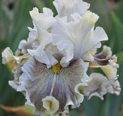 Ирис высокий бородатый Amor (Амор). Потрясающий ирис. Стандарты пепельно-кремово-белые, края оливковые. Фолы — сложный микс бежевого, серого, лавандового и пурпурного. Широкая кайма цвета стандартов. Бородка цвета старого золота. Роскошно гофрирован. Срок цветения средний. Высота 91 см.