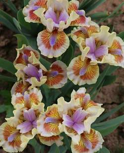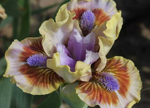 Ирис бородатый карликовый Antsy (Антси). Впечатляющий. Стандарты янтарные, фолы цвета стандартов с большим коричневым пятном по центру. Бородка синяя. Средне-поздний. Высота 36 см.