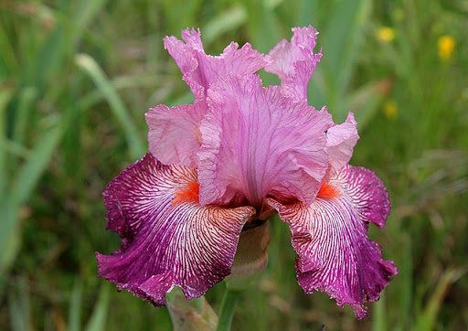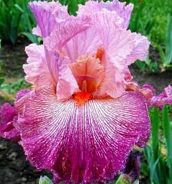 Ирис Anything Goes (Энисинг Гоуз). Стандарты — бленд розового и сиреневато-лилового, фолы более насыщенного цвета, у основания белое пятно. Бородка ярко-оранжевая. Очень пышная и привлекательная пликата. Высота 89 см. Срок цветения средне-ранний.