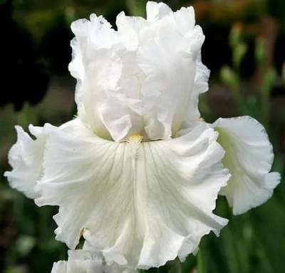 Ирис высокий бородатый Arctic Express (Арктик Экспресс). Белый, чуть зеленоватый, шикарная гофрировка. Парящий. Лепестки сильно гофрированные, фолы прочерчены по прожилкам тонкими геометрическими линиями. Бородка белая, бледно-лимонная в горле с оранжево-жёлтыми кончиками. Имеет награды.