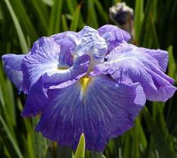 Ирис японский Azure (Азуре). Цветки очень крупные, около 20 см, прекрасного синего цвета, лепестки с желтым сигналом, волнистые. Каждый стебель несет не менее трех цветков.