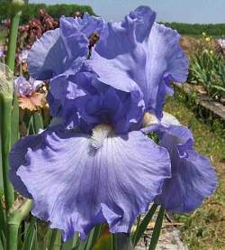 Ирис Babbeling Brook (Бэббелинг Брук). Голубовато-фиолетовый, гофрированный, с сильным ароматом, парящий. Бородка бледно-желтая. Высота 100 см. Цветок крупный, 14 см.