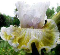 Ирис высокий бородатый Baby I Love You (Бэби Ай Лав Ю). Стандарты льдисто-белые с сиреневым вливанием, в основании золотые. Фолы белые с оливковыми прожилками. Бородка оранжевая. Великолепная форма, красивая гофрировка. Срок цветения средне-поздний. Высота 89 см.