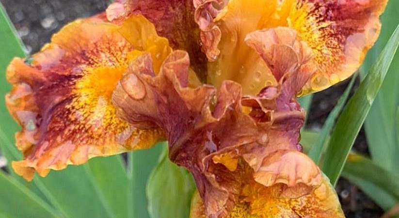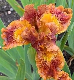 Ирис бородатый карликовый Basket of Goodies (Баскит оф Гудиз). Стандарты карамельно-медно-рыжие. Фолы медные с золотистым пятном у бородки. В центре красное напыление. По краю тонкая золотистая кайма. Бородка оранжевая. Необычный, оригинальный по форме и окраске. Срок цветения средне-поздний. Высота 36 см.