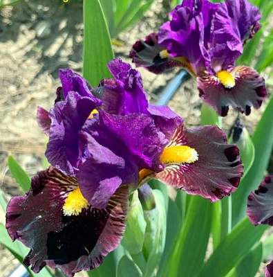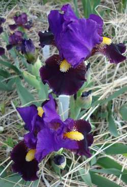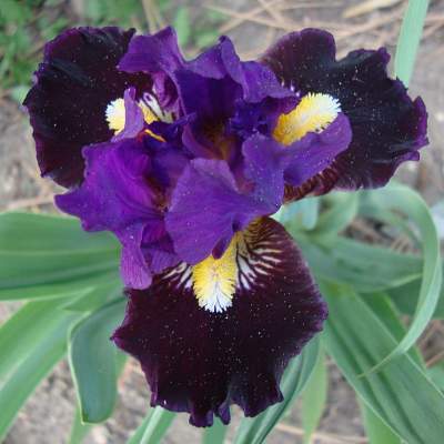 Ирис бородатый карликовый Beckoning (Беконинг). Яркий, бархатисто-плюшевый цветок. Стандарты пурпурные, фолы почти черные. Бородка ярко-желтая. Срок цветения средний. Высота 38 см. Есть награды.