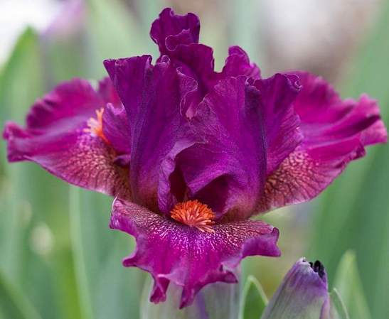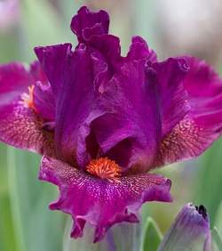 Ирис бородатый карликовый Berrylicious (Беррилишес). Стандарты бордовые, фолы лиловые с черно-красными линиями. У бородки светлая область, по краю серебристая кайма. Бородка крупная, оранжевая. Срок цветения средне-поздний. Высота 33 см.