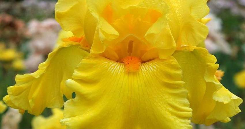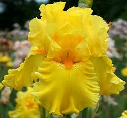 Ирис высокий бородатый Best and Brightest (Бест энд Брайтест). Сверкающе-желтый, фолы чуть темнее, около бородки тонкие белые лучики. Бородка желто-оранжевая. Очень крупный цветок, яркий, гофрированный. Срок цветения средний. Высота 91 см.