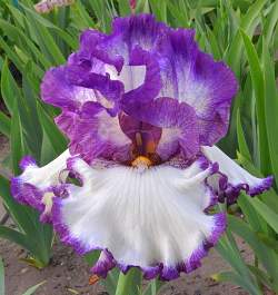 Ирис Big Brother (Биг Бразер). Цветок крупный, фолы белые с фиолетовой каймой. У стандартов кайма широкая, по всему лепестку фиолетовые прожилки. Бородка желтая. Листья крупные, мечевидные. Сорт неприхотливый, хорошо разрастается и стабильно цветет.