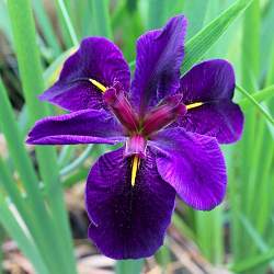 Ирис Black Gamecock (Блэк Геймкок). Цветки крупные 10-12 см, сине-чёрные, однотонные, с ярко-желтой полоской у основания лепестков. Высота 70-80 см.