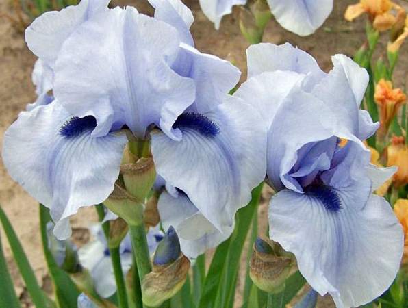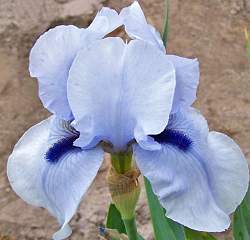 Ирис интермедиа Blackbeard (Блэкбиэд). Необычный и привлекательный контраст бледно-серовато-голубых лепестков и иссиня-черной бородки никого не оставит равнодушным. Высота 65 см. Срок цветения средне-поздний. Имеет несколько наград.