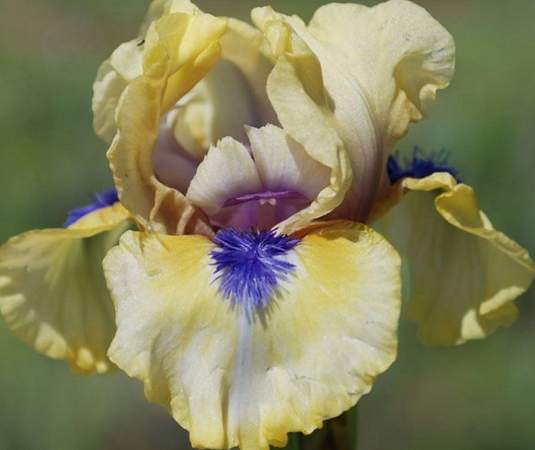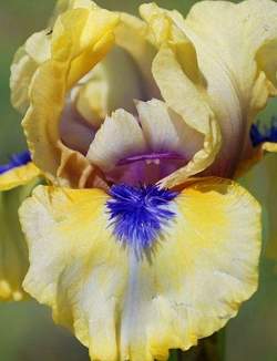 Ирис бородатый карликовый Blue Eyed Girl (Блу Айд Гёл). Стандарты светло-лимонные, в центре ярче. Фолы такие же. Бородка синяя, крупная и пушистая. Удивительный, поражающий воображение. Срок цветения средне-ранний. Высота 38 см.