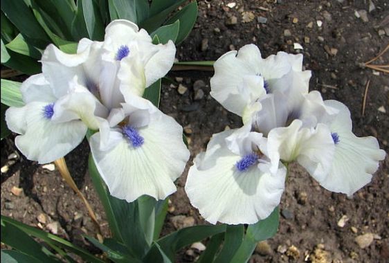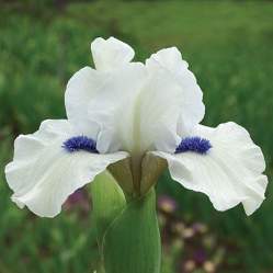 Ирис бородатый карликовый Bluebeard's Ghost (Блубёрдз Гост). Высота 35-37 см. Срок цветения средне-поздний. Чисто белый парящий и гофрированный цветок с зеленоватым напылением по ребру. Насыщенные индиго-синие бородки. Сильный аромат. На цветоносе 2-3 цветка немного выше листьев.