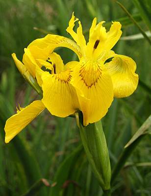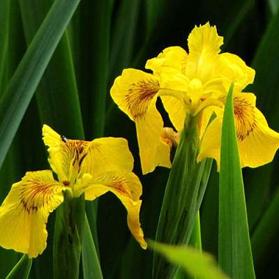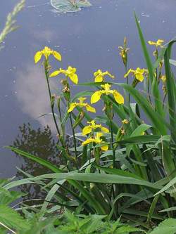 Ирис болотный. Может расти как просто на влажном месте, так и в подтопляемых местах, и на мелководье водоемов (0-10 см воды). При этом переносит полутень, хотя на солнце цветет гораздо лучше. Сорта не так агрессивны, как видовой ирис болотный, но разрастаются довольно быстро. Прекрасно смотрится рядом с водоемом, куртинами на газоне. Зимостоек.
