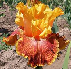 Ирис высокий бородатый Bottle Rocket (Ботл Рокет). Один из самых ярких ирисов. Его видно издалека, он как пламя. Цветет в ранние сроки, в конце сезона может цвести повторно. Стандарты оранжевые, фолы рубиново-красные с оранжевыми прожилками. Бородка морковная. Высота 89 см. Сорт получил высшую награду — Медаль Дайкса! Имеет много других наград.