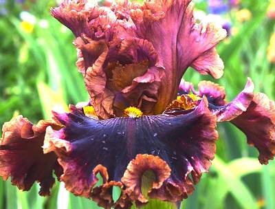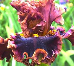 Ирис высокий бородатый Будулай. Стандарты темно-лилово-коричневые. Фолы широкие, вишнево-коричневые с лиловой каймой. бородка желтая. Красиво гофрирован. Смотрится богато! Срок цветения средний, высота 95 см.