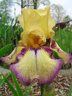 Ирис Bullwinkle (Бульвинкль). Высокий бородатый. Цветок янтарно-желтый, нижние доли с сиренево-коричневой каймой и крапом, слабо гофрирован. Высота 70 см.