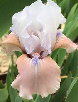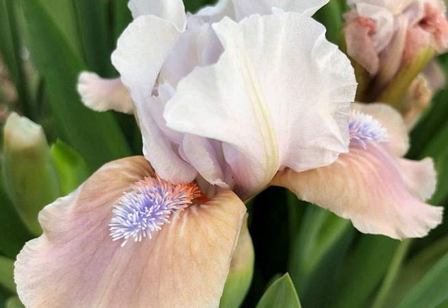 Ирис бородатый карликовый Burlesque Cutie (Бурлеск Кьюти). Стандарты иссиня-белые, фолы бледно-розовые с персиковыми плечиками. В области бородки кремовые жилки, кремовая окантовка. Бородка длинная, светло-мандариновая с лавандовым опушением. Срок цветения средне-поздний. Высота 36 см. Неподражаем!