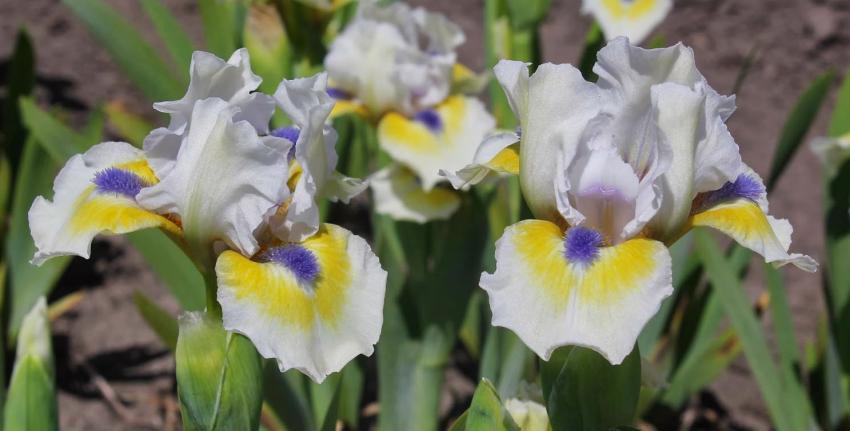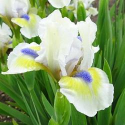 Ирис A Little Good News (Э Литл Гуд Ньюс). Стандарты молочно-белые, фолы такие же с ярким желтым пятном. Бородка оранжевая с сними. Имеет сладкий аромат. Срок цветения поздний. Высота 30 см.