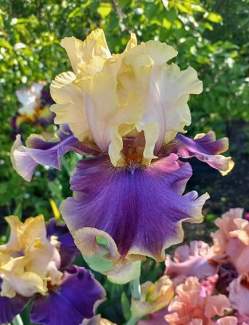 Ирис высокий бородатый Cafe d'Amour (Кафе д'Амур). Экзотическая окраска и потрясающие кружева! Стандарты лимонные, по центральной жилке фиолетовое вливание. Фолы широкие, фиолетовые с синим напылением и прожилками. Кайма тонка, цвета стандартов. Бородка желто-оранжевая. Высота 71 см.