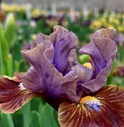 Ирис бородатый карликовый Canine Caper (Канин Кейпер). Стандарты с переходом от фиолетового к серому. Фолы коричневые с размыто-оливковыми краями. Бородка на фоне белого сигнала. Бородка с переходом от цвета календулы к лавандово-голубому. Срок цветения средне-поздний. Высота 39 см. Необычный и очень эффектный!