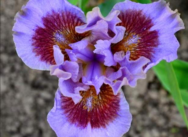 Ирис карликовый Capiche (Капиш). Стандарты дымчато-лавандовые. Фолы нежно-фиолетово-голубые с винным пятном у основания около медно-коричневой бородки. Невероятно нарядный и очень необычный!