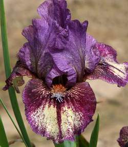 Ирис карликовый Cartoon Characters (Картун Карэктерс). Стандарты темно-пурпурные с белой пликатой. Фолы кремовые с рубиновой пликатой. Бородка медная с белым кончиком. Средне-ранний. Высота 36 см.