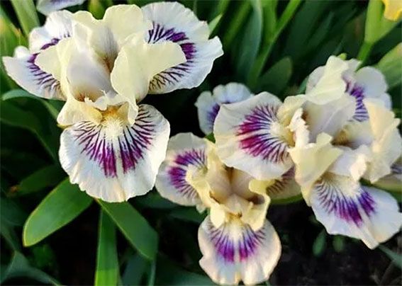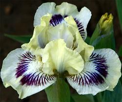 Ирис карликовый Cat and Mouse (Кэт энд Маус). Стандарты зеленоватые с серо-голубыми жилками. Фолы белые с каштановыми жилками на плечиках, меняющими цвет на фиолетовый ниже бородки. У бородки белая вспышка. Бородка золотистая с белым. Срок цветений средне-ранний. Высота 30 см.
