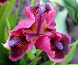 Ирис Cat's Eye (Кэтс Ай). Стандарты и стайлы лилово-розовые. Фолы тёмно-красные с почти чёрными прожилками и широкой лилово-розовой каймой. Бородка лавандовая. Аромат лёгкий, пряный. Поощрительная премия 2004 г. Награда за качество, 2006 г. Медаль Кука-Дугласа, 2008 г.