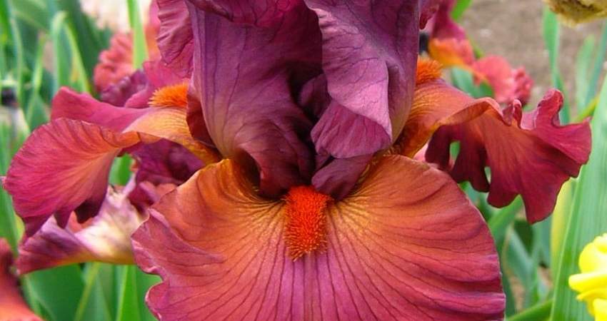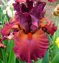 Ирис высокий бородатый Catch the Fever (Кэтч зе Фивер). Стандарты рубиновые, фолы коричневато-оранжевые, края бордовые. Бородка алая. Прекрасная гофрировка. Срок цветения средне-ранний. Высота 86 см.