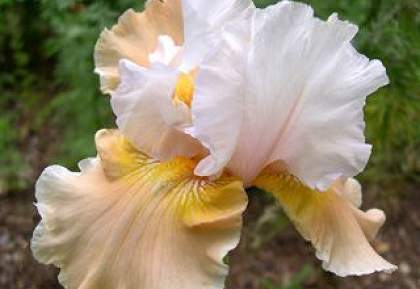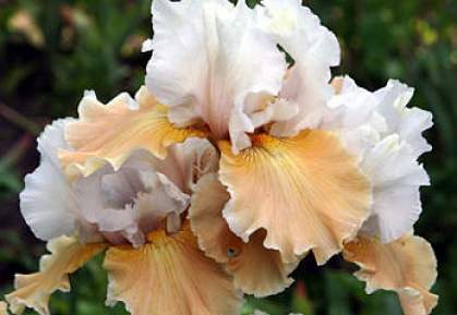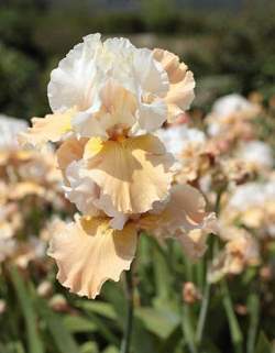 Ирис бородатый Champagne Eleganance (Чампейн Элеганс). Цветки крупного размера, двухцветные, верхние лепестки белого цвета, нижние лососево-абрикосового оттенка, края лепестков сильно гофрированные. Нежный и искрящийся, словно брызги шампанского! Аромат легкий.