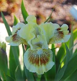 Ирис карликовый Cheerful Chipmunk (Чиэфул Чипманк). Стандарты сливочные. Фолы светло-желтые с коричневым узором по зеленоватому фону. Бородка желто-белая. Средне-ранний. Высота 25 см.