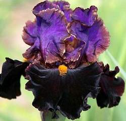 Ирис высокий бородатый Cher and Cher Alike (Чер энд Чер Элайк). Стандарты синие с аметистовым оттенком, обрамлены тонкой золотой каймой. Фолы чернильные, бархатные. Бородка рыжая. Красивый, мерцающий, меняет цвет в зависимости от времени суток. Очень красивая гофрировка. Срок цветения средне-поздний. высота 97 см.