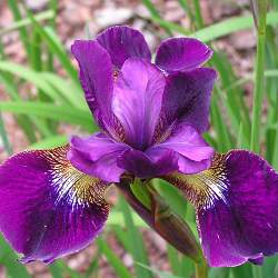 Ирис сибирский Currier (Куриер). Стандарты и фолы тёмно-красно-фиолетовые. Стайлы — смесь светло синего с красным. Фолы с тонкой белой каймой и очень большим белым сигналом с золотистым в основании. Цветение в июне. Высота 85 см.