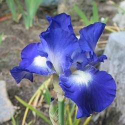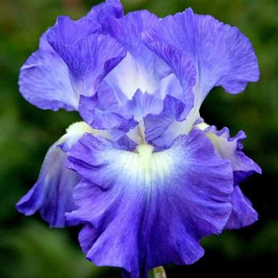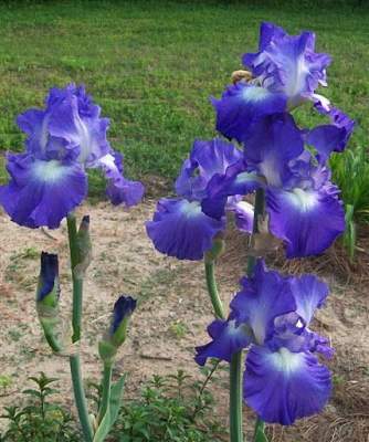 Ирис City Lights (Сити Лайтс). Эффектный однотонный голубовато-фиолетовый с почти белым центром и контрастной лимонно-желтой бородкой; цветки очень крупные — на одном цветоносе может быть до 4-х одновременно открытых бутонов. Высота 94 см. Срок цветения средний. Имеет награды.