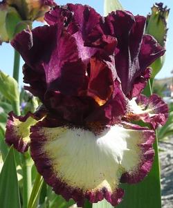 Ирис высокий бородатый Class Ring (Класс Ринг). Невероятный красавец! Стандарты рубиновые. Фолы белые с широкой каймой цвета стандартов. Бородка коричневато-бордовая. Роскошно гофрирован. Кружевной. Ранне-среднего срока цветения. Высота 91 см. Есть награды.