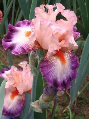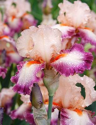 Ирис высокий бородатый Come Away With Me (Кам Эвей Виз Ми). Стандарты теплого розового цвета с переливанием в абрикосовый. Фолы розовато-оранжевые с широкой пурпурной каймой. Бородка мандариновая. Отлично гофрирован. Высота 97 см. Имеет награды.