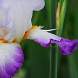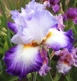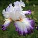 Ирис Conjuration (Конжерейшн). Белые стандарты покрыты палево-фиолетовыми прожилками, фолы белые с яркой аметистово-фиолетовой каймой, бородка белая с оранжевым верхом и пушистым белым рогом.