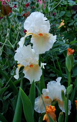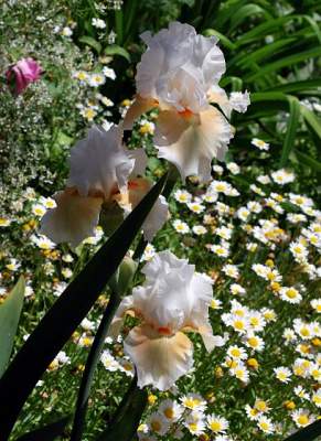 Бородатые ирисы очень нужны и в цветниках. Они имеют большое разнообразие окрасок. Прекрасно комбинируются сиреневые луки и двухцветные желто-сиреневые ирисы. Гармоничная композиция получится с бедренцем, буквицей, геранями (представьте рядом мягкие подушки герани и мечевидные листья ирисов!). А также с зопником, лилией мартагон, видовыми виолами…