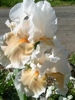 Ирис Coral Chalice (Корал Шалис). Стандарты белые, фолы лососево-розовые, переходящие в белые в нижней трети. Бородки оранжевые. Высота цветоноса: 75-90 см. Срок цветения средне-поздний.