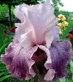 Ирис Crazy for You (Крейзи Фо Ю). Стандарты устрично-серебристые с розово-бежевым напылением, фолы темно-сиренево-розовые с более светлой каймой и устрично-серыми прожилками.