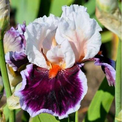 Ирис высокий бородатый Crimson Cloud (Кримсон Клауд). Стандарты белые с лососевым тоном по центральной жилке. Фолы красно-фиолетовые с каймой в цвет стандартов. Бородка мандариновая. Красивая гофрировка. Высота 91 см.