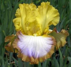 Ирис высокий бородатый Custom Rim (Кастом Рим). Стандарты кукурузно-желтые с зеленоватыми жилками. Фолы переливающиеся — от белого до палево-фиолетового. Роскошная бронзовая кайма. Бородка желтая. Красивая гофрировка. Срок цветения средне-поздний. Высота 89 см.