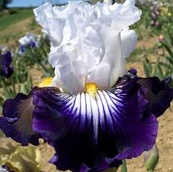 Ирис высокий бородатый Dancing Star (Дансинг Стар). Стандарты белые, фолы пурпурно-синие. Вокруг бородки белое пятно, покрытое фиолетовыми жилками. Бородка золотая. Сорт красивейший и легко разрастается. Срок цветения средне-ранний, высота 99 см. Имеет награды.