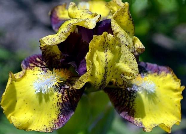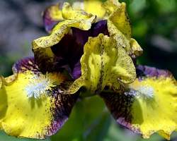 Ирис карликовый Darn Cute (Дарн Кьют). Стандарты лимонно-желтые с темно-сливовой пликатой у основания. Фолы желтые с пликатой на плечиках. Бородка оранжевая с белым. Срок цветения средне-ранний. Высота 38 см.