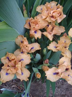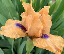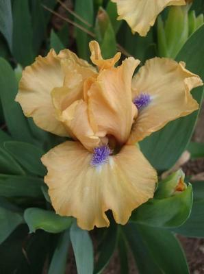 Ирис карликовый Decorum (Декорум). Стандарты абрикосовые. Фолы с желтоватым оттенком. Бородка переливается от красно-оранжевого в основании до темно-синего на кончике. Высота 33 см. Срок цветения средний.