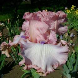 Ирис высокий бородатый Don't Stop Believing (Донт Стоп Беливин). Стандарты розовые, огромные, роскошные. Фолы белые с широкой кружевной каймой в тон стандартов. Бородка светло-фиолетовая. Невероятно красивый сорт. Высота 107 см.