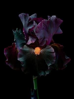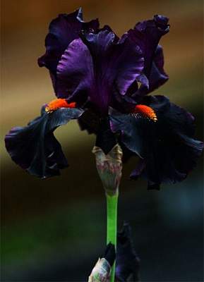 Ирис Dracula's Kiss (Дракулас Кисс). Стандарты и стайлы сливово-фиолетовые, очень тёмные. Фолы чёрно-пурпурные, с небольшим жёлтым жилкованием в основании. Бородка большая, мандариновая, очень контрастная. Цветоносы имеют 4 ответвления и 9-12 бутонов. Почётный отзыв, 2011 г., НM - 2011; AM - 2013.