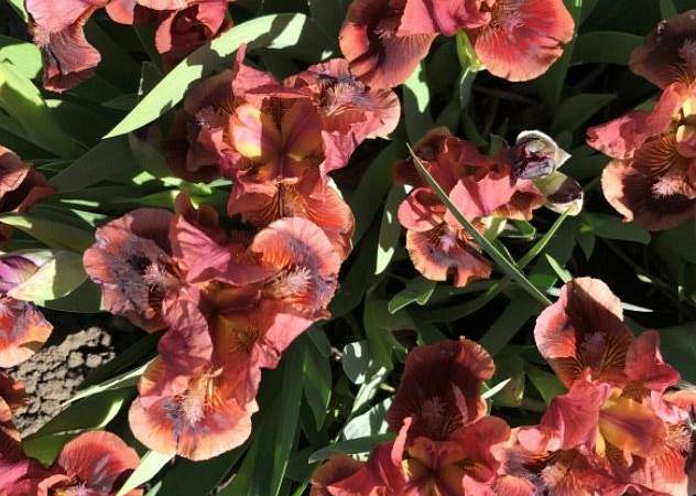 Ирис бородатый карликовый Dyka Gorobunka (Дыка Горобынка). Стандарты кирпично-красные, фолы кирпичные с большим бордовым пятном. Бородка горчичная с лиловым. Средне-ранний. Высота 37 см. Очень красивый. "Горобынка" — по-украински рябинка.