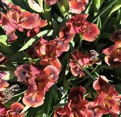 Ирис бородатый карликовый Dyka Gorobunka (Дыка Горобынка). Стандарты кирпично-красные, фолы кирпичные с большим бордовым пятном. Бородка горчичная с лиловым. Средне-ранний. Высота 37 см. Очень красивый. "Горобынка" — по-украински рябинка.